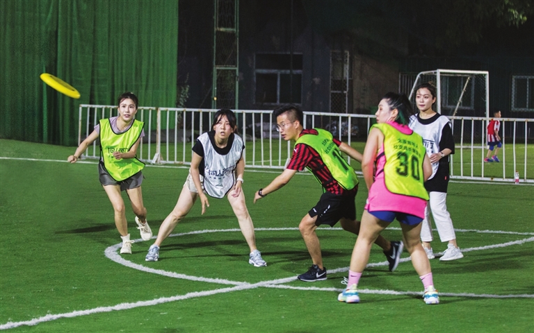 7月14日,市民在省全民健身中心进行“飞盘”运动。该运动既亲近自然、又拓宽了社交面,深受群众喜爱。 王韵菲 摄