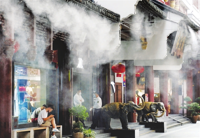 7月14日,上海豫园商城启用喷雾装置进行防暑降温。