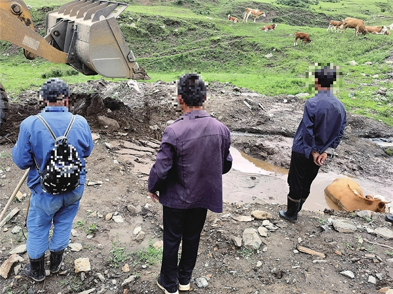 当天下午4时许,盖家庄乡村民景某在村子一山沟里放牛时,由于受近期强降雨影响,路面泥土松软,一头黄牛吃草时不慎滑入一个大泥坑。因坑里全是淤泥,黄牛深陷其中无法动弹,景某想尽各种办法也没法让黄牛脱困,只好向警方求助。