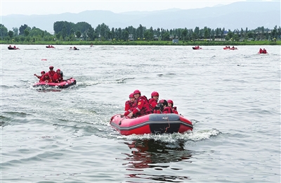 7月17日,汾河景区晋阳桥南侧水域,山西天龙救援队组织100多人,15条冲锋舟,展开舟艇驾驶与搜救、声纳探测仪和水下机器人使用保养等应急演练,提升应急救援能力。 记者 韩双喜 摄