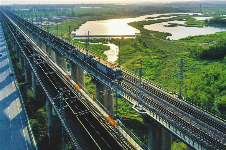重载列车行驶在大秦铁路上(7月16日摄,无人机照片)。