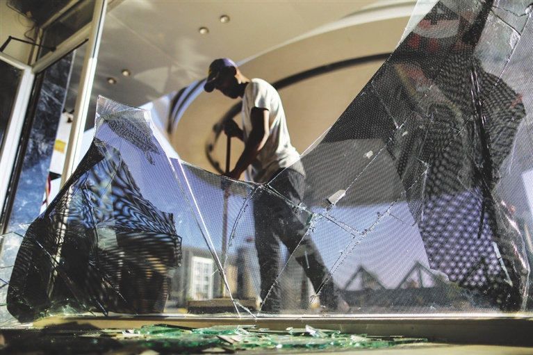 7月16日,一名巴勒斯坦男子在加沙地带清理空袭过后破碎的玻璃。