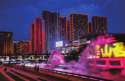 7月16日晚,绚丽的水幕灯光秀在长风商务区上演,以夜空为幕,灯光、喷泉、音乐相互交融,带给人们视觉的震撼。 王韵菲 摄
