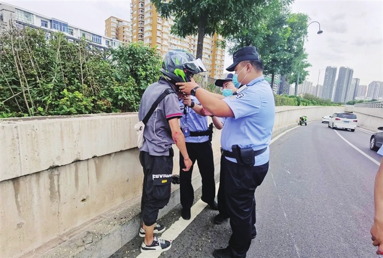 “快停车,有人摔倒了,赶紧下去看一下……”当天,民警郭伟和同事们出警返回派出所,从西往东经过北沙河快速路时,看到一名骑摩托车男子不慎摔倒。民警立即下车,将骑手扶至路边安全地带。骑手胳膊、双腿均有不同程度擦伤,衣服也有破损,但意识清醒,能清楚回答民警的问题。