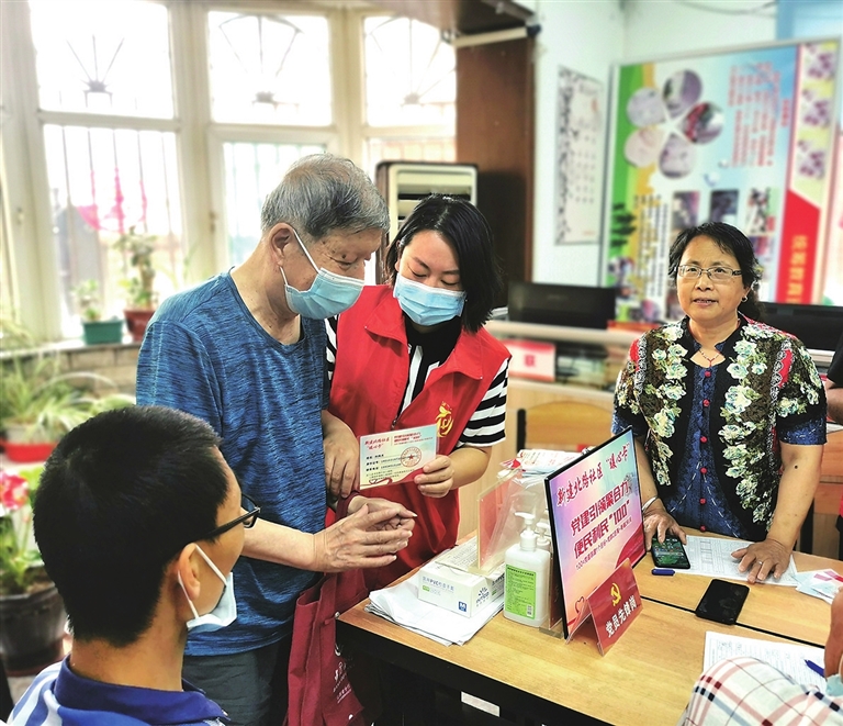 7月19日上午,巨轮街道新建北路社区党支部联合市果品茶叶副食总公司北批发部党支部,为社区68名残疾人员和14名低保户发放了“暖心卡”,在北批市场购买蔬菜、水果、肉类、粮油等六大类食品时能享受实实在在的优惠。 李晓琳 摄