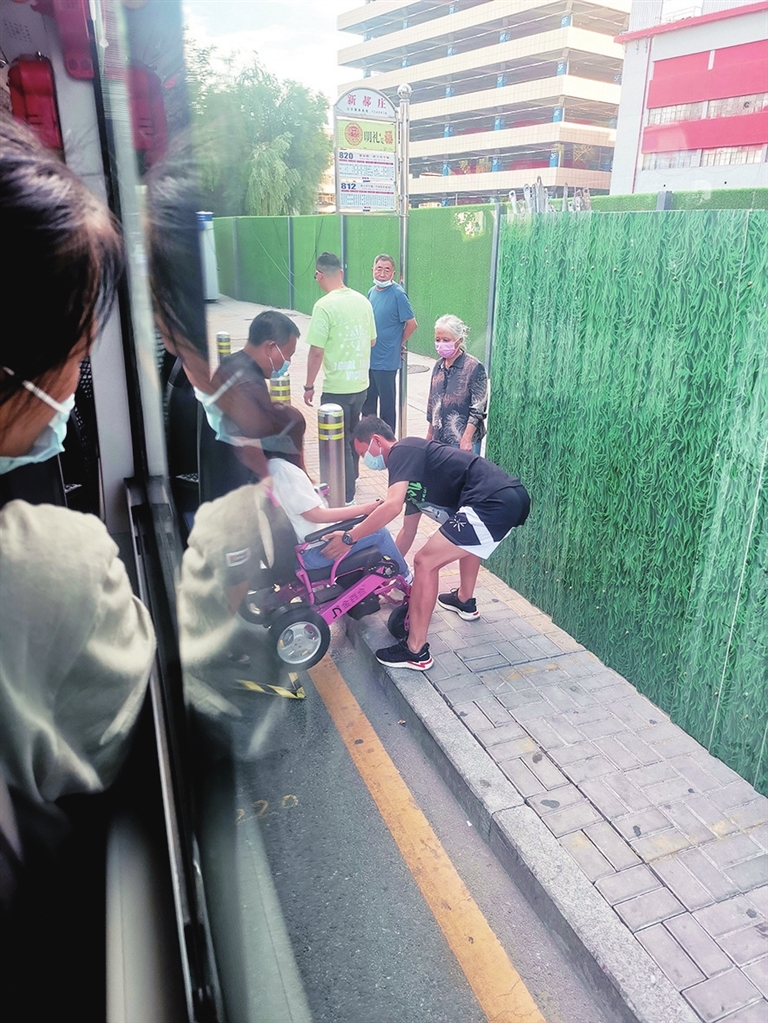 7月18日傍晚6时许,一辆820路公交车行驶至新郝庄公交站时,上演感人一幕。两名前往双塔公园游玩的轮椅女孩下车不便,家属急得满头大汗,乘客见状纷纷伸出援手,令人动容。 郭晓华 摄