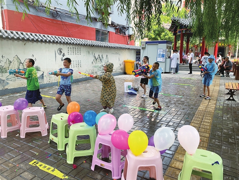 7月20日,文庙街道新城北街社区组织孩子们拿起水枪,纵情打水战,在这个夏天感受清凉,释放爱玩天性。 侯慧琴 张锡琳 摄
