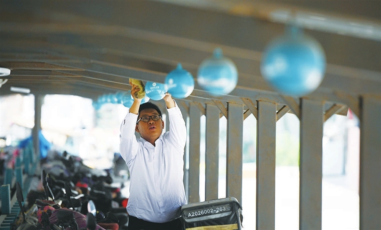 7月20日,山西五建背圪洞宿舍内,物业人员正在安装调试消防灭火弹。每个“灭火弹”覆盖面积约2平方米,能够对电动自行车起火实施有效扑救。 邓寅明 摄