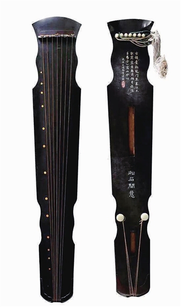 “松石间意”琴 “松石间意”琴是北宋宣和二年(1120)东京(今开封)“官琴局”御制。该琴通长126厘米,隐间肩宽21.3厘米、尾宽14.8厘米。上板梧桐、下板梓木,金徽玉轸,琴身涂大漆掺有鹿角灰、朱砂、金、银细粒,属琴家最为看重的“八宝灰胎”。面蛇腹纹间冰裂断,底细密流水牛毛断。琴腹池内右刻“宣和二年御制”,左刻“康熙庚午王汉章重修”,可见该琴在清康熙二十九年(1690)琴工王汉章曾重加整修。 |