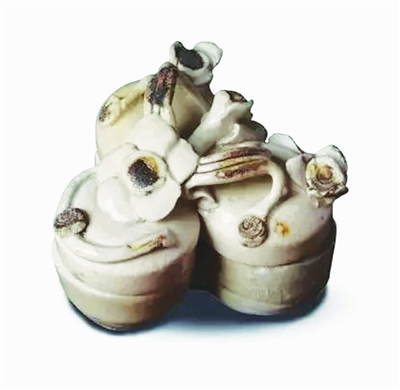 青白釉褐彩三连盒 青白釉褐彩三连盒盖与盒身以子母口扣合,三根花茎缠绕在盖顶,其中一盒盖面上捏塑有一朵盛开的花朵,另两盒的盒面各捏塑一朵含苞待放的小花蕾,显得格外美观。该三联盒子母口无釉,里外施满青白釉,花蕊、花蕾及花茎都以褐彩点缀。盒盖和盒身用深而宽的刀痕刻划出花瓣纹,增加了三联盒的立体感。这种瓷盒子主要用途为盛装药品、化妆品和香料等。 |