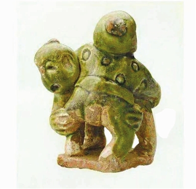 绿釉相扑俑 绿釉相扑俑是一件罕见的相扑俑,现藏于河南博物院。该俑为手塑,陶胎,低温绿釉。俑被设置在长3.6厘米、宽2.7厘米的长方台座上,通高6.4厘米。二俑皆裸体,赤脚,头系发髻,身束腰带,弓步俯身。居上者上体饰有阴线圈,昂首张口,皱眉瞠目,右手扒着对方的臀部,左手抱腰,力决胜负。居下者也不甘示弱,面部向内,双手紧紧扒着对方,奋力挣脱。俑身饰阴线圈似象征大汗淋漓、汗珠如豆,更增添了二者相持不下、难解难分的紧张感。 |