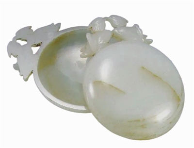 白玉质,润洁细腻,局部有浸蚀后的黄色绺纹。圆形盒上圆雕一对鸳鸯,口、胸相连,以均匀的细阴刻线琢出冠、眼、羽毛,盒为子母口,鸳鸯却是平剖为二,打开时分为两对鸳鸯。 |