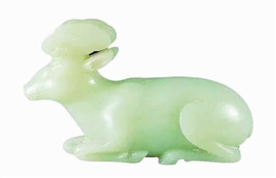 卧鹿形玉嵌饰 卧鹿形玉嵌饰由北京师范大学工地清代黑舍里氏墓出土,长10.6厘米,高6.5厘米,青玉质,温润无瑕,圆雕而成。鹿作跪卧状,抬首前视,双耳贴于角下,角作灵芝状,亦称“肿骨鹿”。四肢收于腹下,短尾紧贴右侧。背面平素,上下各有三对穿系,似作嵌饰用。鹿通体光素,碾磨精湛,抛光度极好,显得古朴浑厚,是出土宋代玉作中的精品。 |
