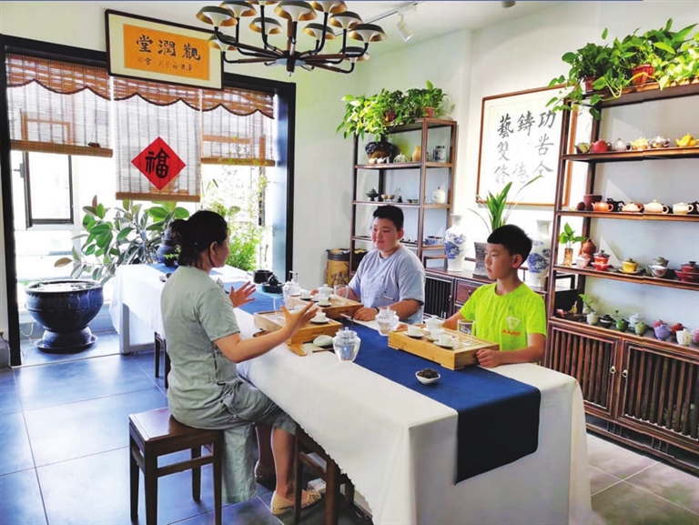 “茶道在我国有数千年的历史,而且在不断发展过程中,形成了一整套规矩礼仪。因为茶道讲究清幽,所以我们泡茶的场所要安静,着装也要朴素整洁,才能品出茶的意趣……”7月18日,在茶艺课现场,伴随着悠扬的古曲,梁生丽娓娓道来,原本有些跳脱的两人“肉眼可见”变得安静下来,双手叠放在茶台上,挺胸收腹,端正了坐姿。