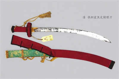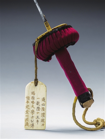 作为清宫武备的明星展品,遏必隆腰刀因其自身的故事性被人熟知。该刀以人名命名,是清朝外戚大臣遏必隆所使用的宝刀。康熙初年,遏必隆与鳌拜、索尼、苏克萨哈同为四大辅政大臣,后被册封一等公加太师衔,风光无限。康熙十二年,遏必隆病故,其刀入藏内府,乾隆十三年以“尚方宝剑”的身份由大学士傅恒被带往金川前线。几个月后,身为遏必隆之孙,军机大臣、保和殿大学士的讷亲,因在之前金川之战中指挥不当被乾隆皇帝命人用遏必隆刀正法于军前。而后,咸丰年间太平天国运动爆发,钦差赛尚阿奉命与太平军交战,同样受赐遏必隆刀,具有先斩后奏的权力,可谓是真正的“尚方宝剑”。