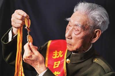 6月8日,在江苏省常州市,抗战老战士冯则连展示纪念章。