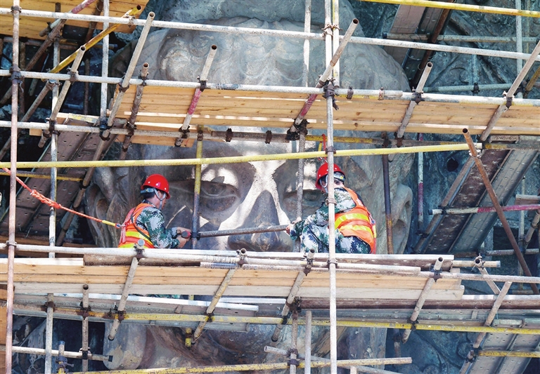 7月21日,固定在奉先寺崖壁上的脚手架及防护网开始有序拆除,洛阳龙门石窟奉先寺大型渗漏水治理和危岩体加固保护工程完工。奉先寺位于龙门西山南段,是龙门石窟开凿规模最大、最具代表性的摩崖像龛。其内的卢舍那大佛,是龙门石窟中艺术水平最高、规模最大的造像。 新华社 发
