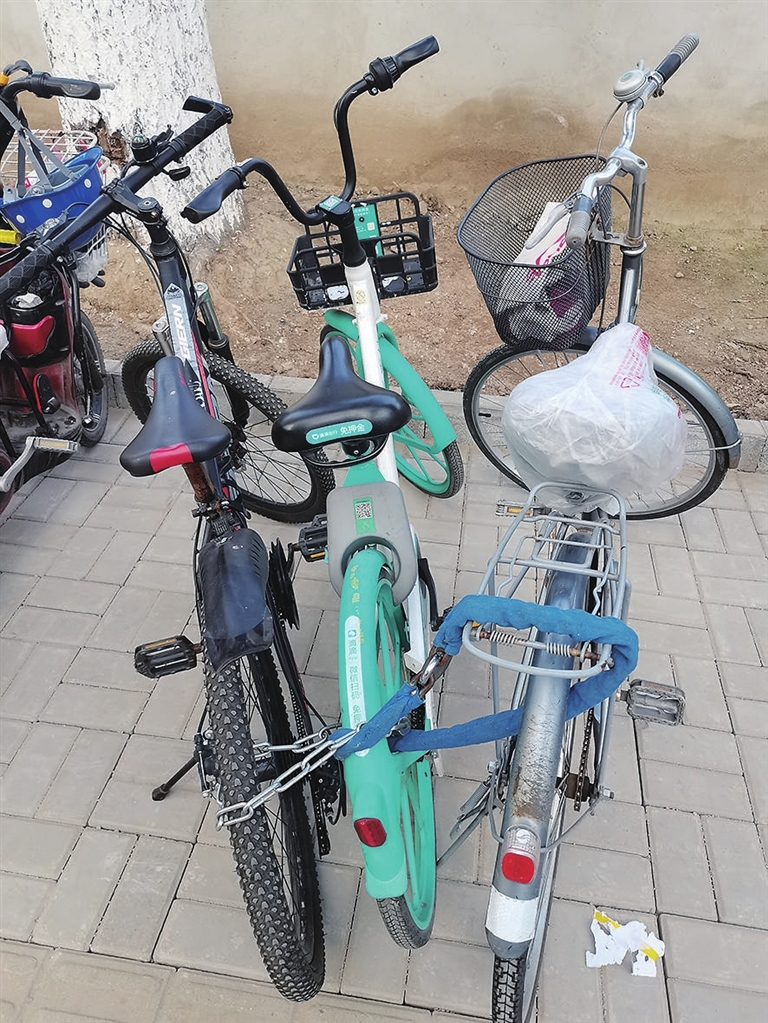 拍摄经过:7月21日上午,我途经新建北路龙潭公园,在附近的人行便道上看到这样一幕:三辆自行车被一根粗链锁锁在一起,一辆共享单车被锁在中间。我分析,这是有人为了自己骑行方便,将公用自行车暂时“为己所用”,这种占用公共资源,图自己方便的做法值得商榷。