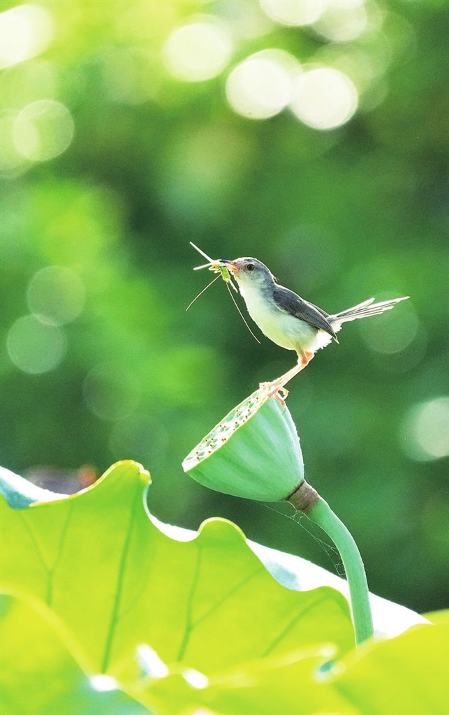 广西南宁市一处荷塘,小鸟在捕虫(7月11日摄)。 7月23日是大暑节气,大暑前后,土地湿润,天气炎热,农作物生长最快,草木郁郁葱葱。 新华社 发