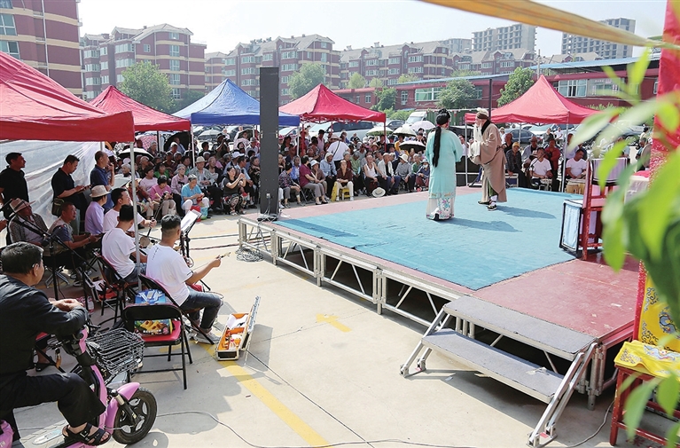7月23日,“山西省2022年免费送戏下乡一万场”活动来到晋源区金胜社区,市实验晋剧团的演员们带来了《走山》《拾黄金》等经典晋剧,让居民们大饱眼福。 李玉锁 摄