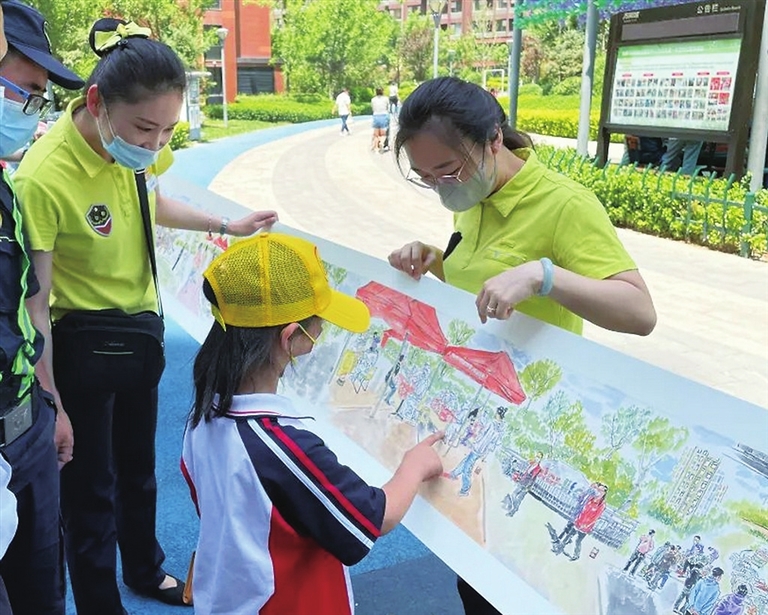 周先生介绍,这幅《芳菲万科城》经构思、起稿、磨稿、着色、送裱,历时半个月,刻画了25个场景105个人物形象。画内,门岗笔直站立、核酸检测井然有序、消杀一丝不苟……让观看的社区和物业工作人员回想起了不久前的4月份。