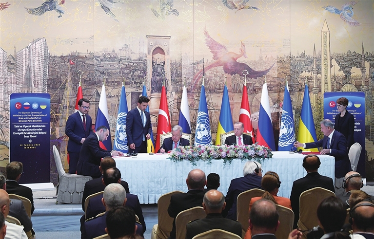 签署协议前,古特雷斯和土耳其总统埃尔多安分别发表讲话。古特雷斯说,将农产品运往世界各地的市场将有助于消除全球粮食供应短缺,缓解价格高企的压力。即将签署的协议必须得到全面实施,因为世界迫切需要该协议以应对全球粮食危机。