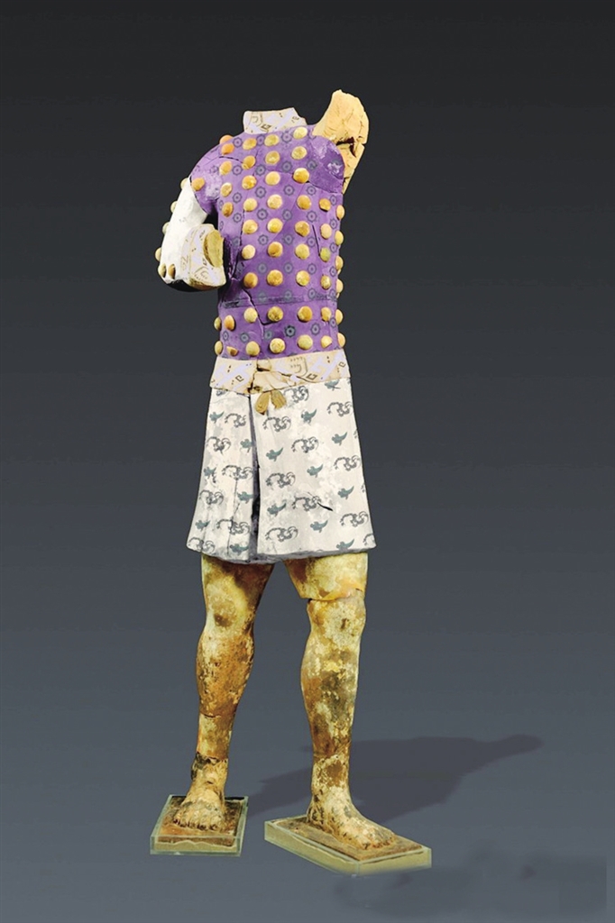 4号陶俑上身着布满泡钉的衣服,泡钉间绘有正中点缀着黄色连珠纹的太阳八角纹,领缘、袖缘和腰带上则残留有几何纹饰,间或装饰有“草叶纹”,肉眼可观察到白色、黑色、黄色和紫色。下身所穿着的裳上,则分布有“云气纹”。