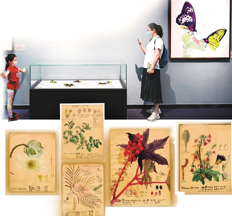 静卧的斑海豹憨态可掬,一大一小,一灰一白,乌溜溜的黑眼珠闪烁着明澈的光亮;斑斓的歌利亚鸟翼凤蝶围花起舞,采蜜的姿态活灵活现……展厅中,与古老的植物科学画相对应的,还有8幅由北京自博专业人员以现代手法创作的动物科学画。