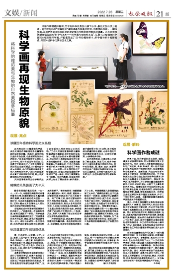展出的科学画绘制的笔触极为细腻,莲花梗上的散生小刺、蓖麻叶脉的颜色和纹路等都清晰可见。“这些形态特征的展示,是普通艺术绘画和彩色摄影甚至真实的植物标本都难以达到的,为植物分类学研究提供了详细信息和依据。” 据《北京晚报》