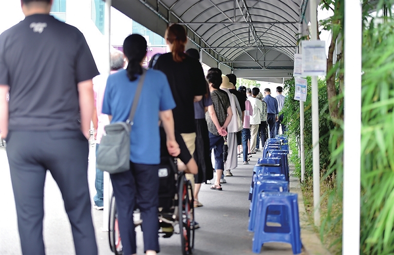 7月27日,人们在韩国大邱市的一处核酸检测点排队进行核酸检测。
