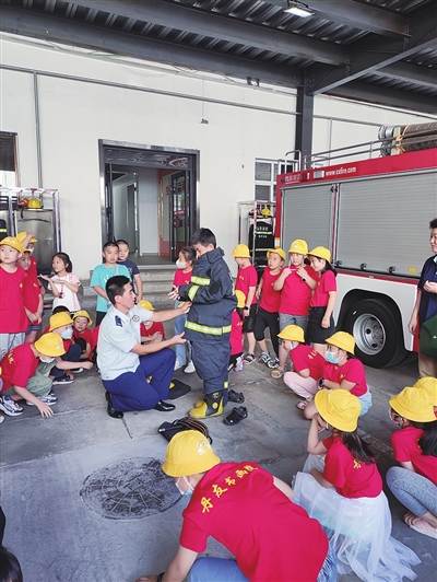 7月28日,文庙街道组织五一东街等社区前往迎泽区消防救援大队慰问,孩子们向消防队员赠送自己亲手做的扇子,并体验消防员生活。 侯慧琴 白凌 摄