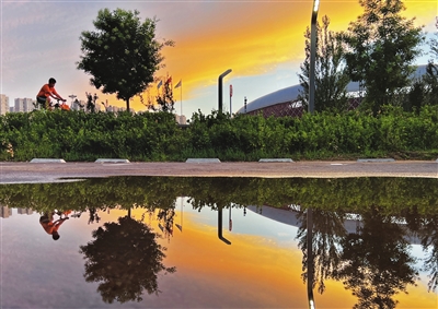 7月29日傍晚,晚霞映衬下的汾河景区分外迷人,市民走出家门享受夏日清凉。 王韵菲 摄
