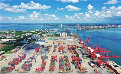 海南洋浦国际集装箱码头港区,船舶往来穿梭,装卸作业繁忙。今年6月,洋浦港口集装箱吞吐量单月首次突破15万标箱,同比增长33.58%。