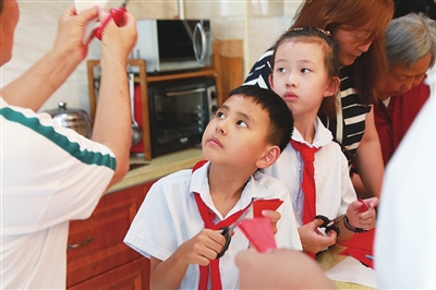 红船、党徽、天安门……在孙奶奶展示讲解的数件作品中,少先队员们兴奋地找着一个个红色元素。趁着孩子们兴趣大增,孙奶奶和搭档现场给他们上了一节传授剪纸技艺的入门体验课《我爱闪闪红星》。