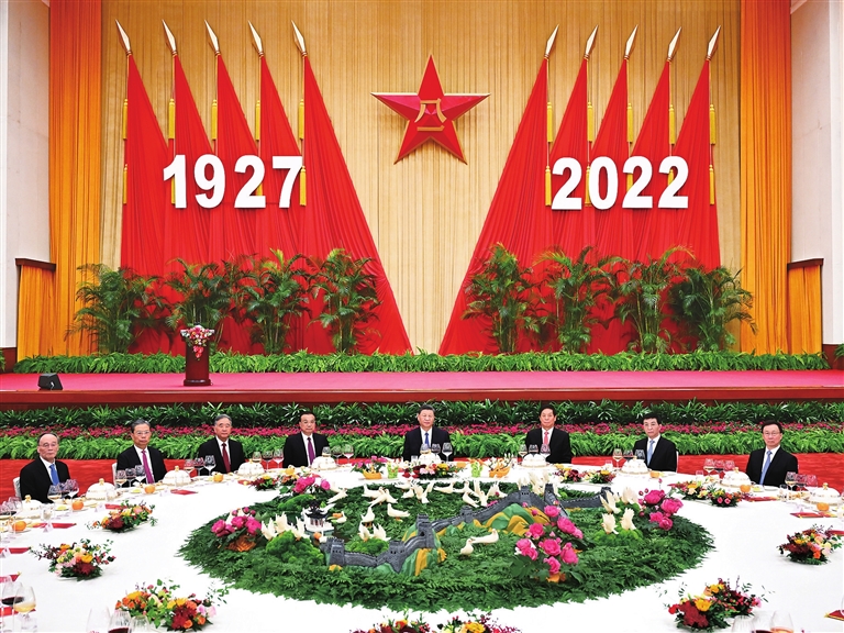 人民大会堂宴会厅灯火璀璨,洋溢着热烈喜庆的节日气氛。主席台上方悬挂着庄严的“八一”军徽,“1927-2022”的大字年号在红旗映衬下格外醒目,昭示着中国人民解放军走过95年的光辉历程。