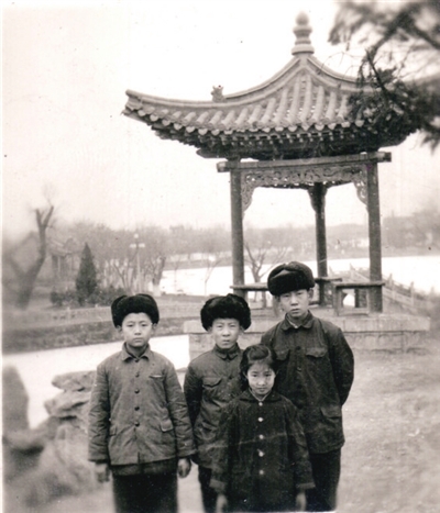 买好帽子后,我们又高兴地来到人民公园(现为文瀛公园)玩耍。见我们齐刷刷地戴着“雷锋帽”的模样,父亲一高兴,又花了几角钱找来了公园的流动照相师为我们拍照。为了显得“虎气”,我们哥仨个统一把护耳整齐地翻上帽顶,又相互之间给对方端正了帽墙,这才请照相师摁下快门。后排从右到左依次是我们兄弟三人,我是长子,前排年幼的妹妹只是好奇地跟着我们玩耍。