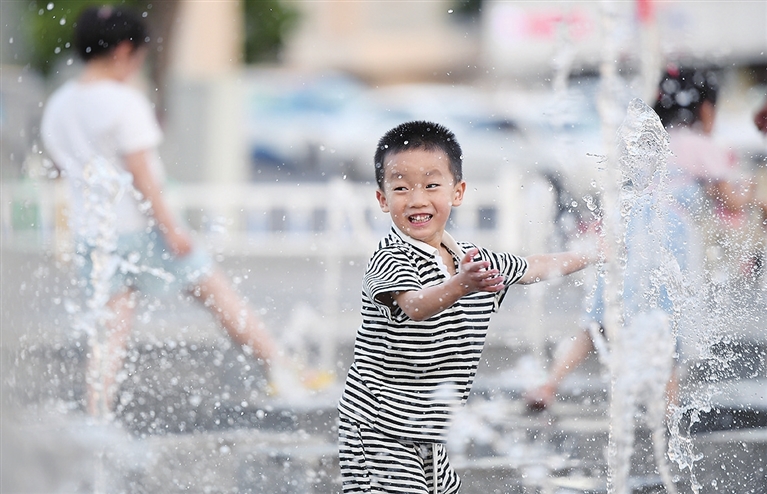 8月1日,天气炎热,省城一处喷泉广场成了孩子们的避暑好去处。 邓寅明 摄