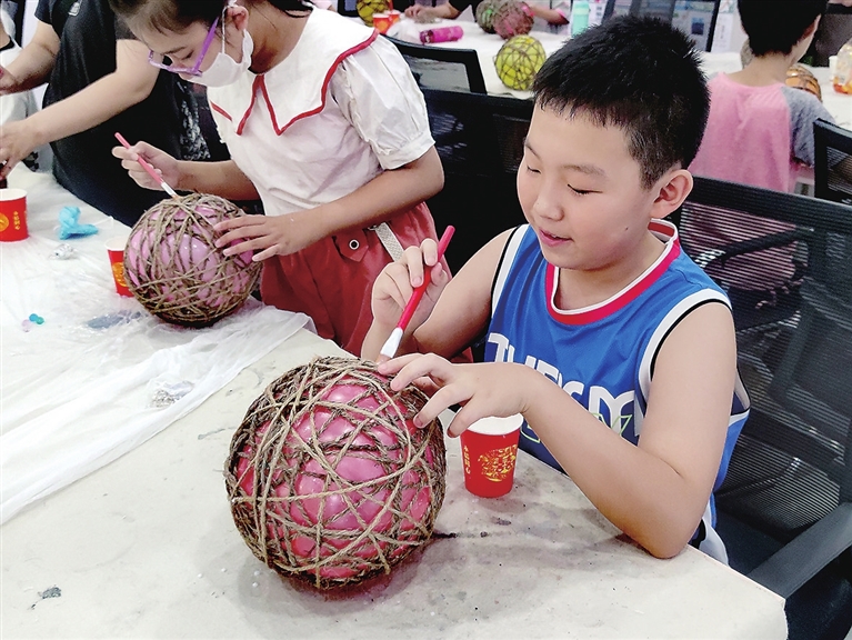 “准备一个气球,将粘有稀释后白乳胶的麻绳随意地缠绕在上面,等缠满后让它干透,再把气球扎破取出,麻绳灯罩就制作好了,装上灯泡就会亮起来。”7月末的一个下午,巨轮街道富力华庭社区举办的麻绳灯手工制作公益活动吸引了社区十几位小学生参与,孩子们围坐桌前聚精会神地听授课老师耐心讲解后,自己动手制作了麻绳灯。