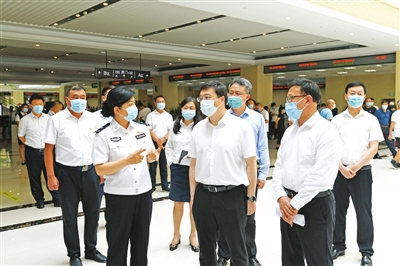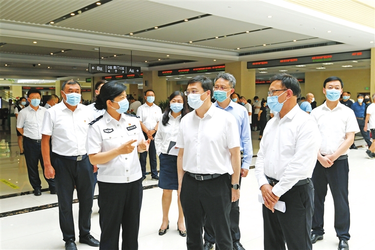 市政务服务中心是服务企业群众的重要窗口。韦韬步入中心,听取“一枚印章管审批”改革情况汇报,走到企业登记注册、公安业务、不动产办理、工程建设项目联合审批、社会事务、社会保险等服务区域,询问办理事项、审批流程、便民措施,了解线下“一窗办结”、线上“一网通办”等审批服务改革举措,要求进一步深化“放管服”改革,学习借鉴先进地区经验做法,不断优化审批流程,提升服务效能,最大程度为市场主体创造便利。