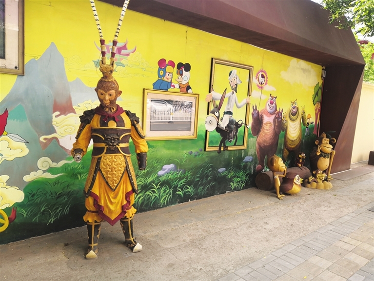 8月2日,记者在现场看到,北肖墙怀旧文化墙共分为“老电车”“老街巷”“老物件”“大象滑梯”“童话世界”“航空航天”六个主题景观。远远看去,这些文化墙存在不同程度的破损,有些墙面墙皮脱落,甚至开裂。这些文化墙中,“老街巷”和“童话世界”文化墙的雕塑破损最为严重。“老街巷”前,“跳方格”的小孩雕塑因为损坏严重被拆掉,只剩下两个“脚印”,而“童话世界”文化墙的孙悟空雕塑,没了“手”和“金箍棒”,看着令人痛惜。