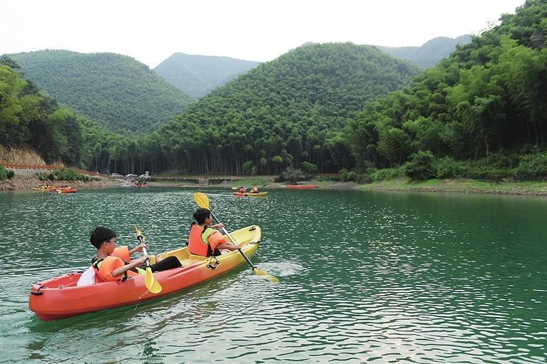 8月1日,小学生在位于绍兴市富盛镇的水上运动基地参加皮划艇拓展活动。