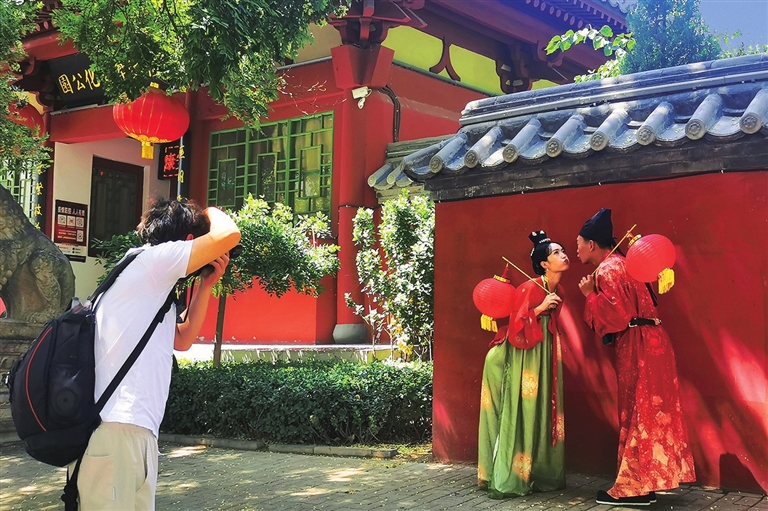 8月3日,狄仁杰文化公园红墙下,一对身着传统服饰的情侣正在拍摄写真。七夕来临,传统文化再次受到市民追捧。 记者 牛利敏 摄