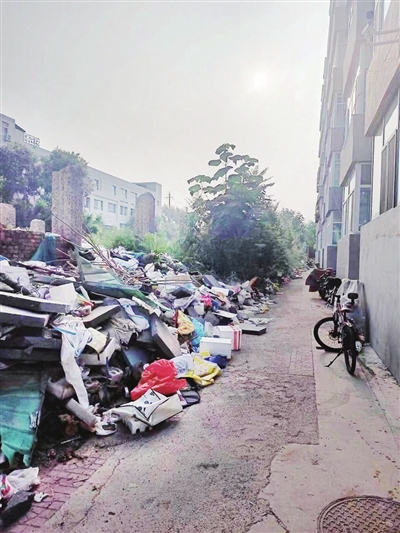 昱兴景苑小区位于迎泽区双塔南路18号。在该小区7号楼门前不足两米处,一座颇具规模的“垃圾山”让人瞠目结舌。“山上”既有砖块、金属片这样的建筑垃圾,也有泡沫塑料箱、塑料袋这样的生活垃圾,还有树枝等堆放在上面。