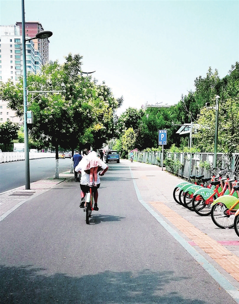 8月3日中午11时许,旱西门街,一位老人骑着公交自行车,身后一名小孩双脚踩在车座上,着实让人担心。 司勇 摄