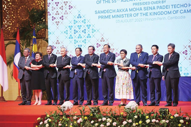 8月3日,在柬埔寨首都金边,参加东盟外长会议的官员们合影。
