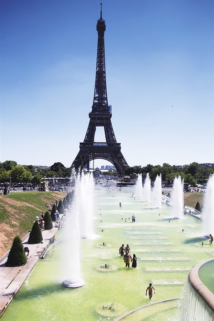 8月3日,人们在法国巴黎埃菲尔铁塔附近的特罗卡德罗喷泉里乘凉降温。 新华社 发