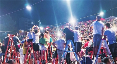 早来的人还会随身带一碗粉,饿的时候嗦上两口垫垫肚子;晚来的人就只能从一个个后脑勺的缝隙里找到适合自己的观赛角度。