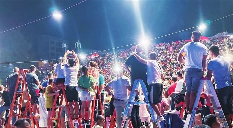 等到比赛开打,人就更多了——前排的席地而坐,后一排坐在马扎上,再后一排坐在塑料板凳上,紧接着是站着的人群,再往后是站在板凳上的观众,最后一排则属于把村里梯子买空的人们。