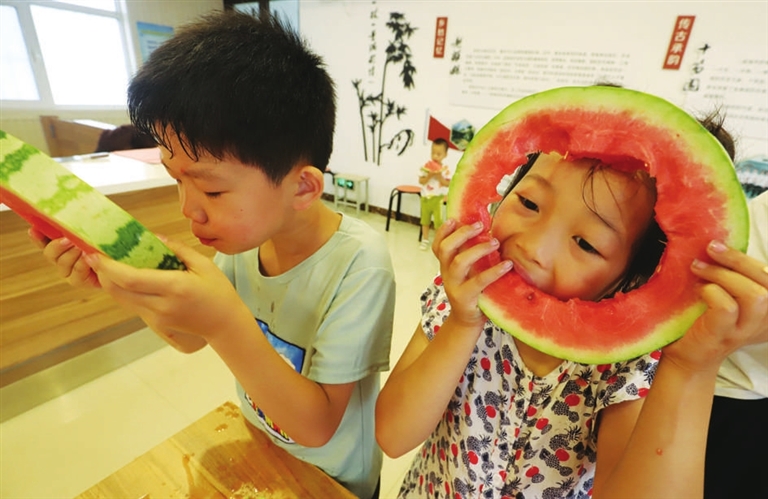 8月6日,在山东省潍坊市潍城区城关街道十笏园社区,小朋友在吃西瓜“啃秋”。