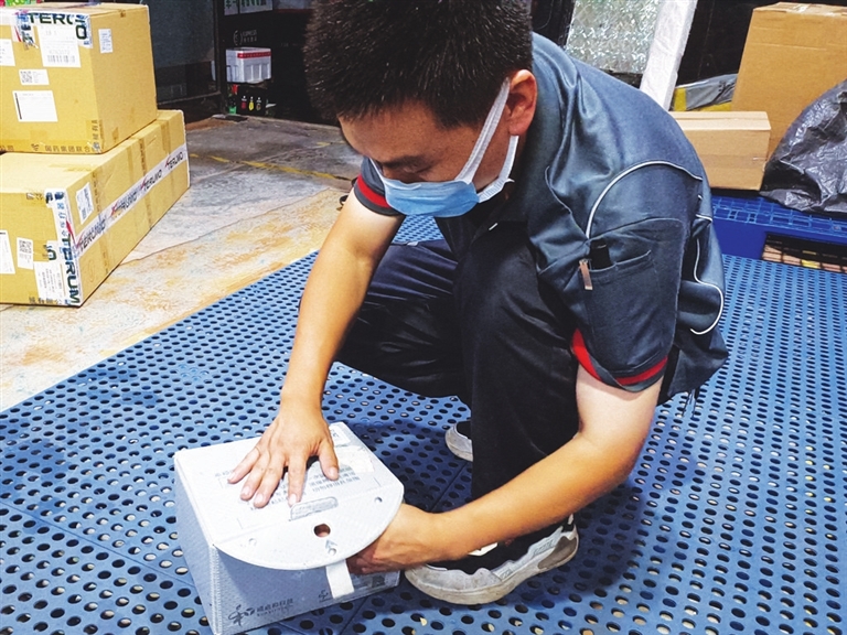 封箱完成后,快递小哥韩伟给记者演示了一下这个快递箱的抗挤压程度:他把双臂放在快递箱上,用整个上半身的力量向箱子施压,但箱子丝毫未变形。据悉,普通的快递箱由收件人自己处置,而这种可循环快递箱在收件人收到快递后,还要由快递员拿走回收。